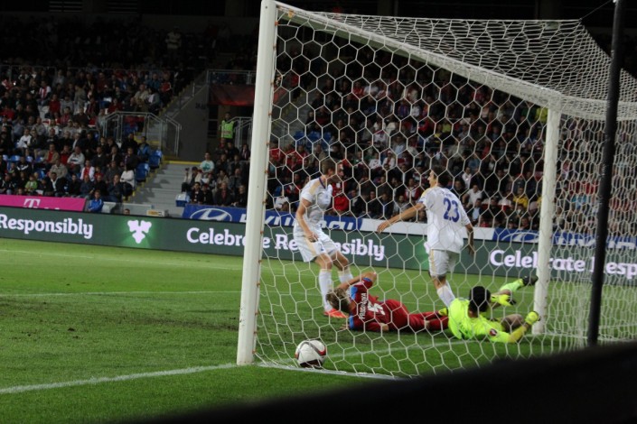 Встреча состоялась в городе Пльзень на стадионе "Дусан Арена" и завершилась со счетом 2:1 в пользу сборной Чехии. Хозяева, ведомые домашними болельщиками, со стартового свистка понеслись в атаку. Уже на второй минуте Лафата пробил по воротам Стаса Покатилова, но его удар оказался неточным. После этого чехи предприняли еще пару атак, но безуспешно. Сборная Казахстана, выдержав натиск соперника, сумела организовать атаку и на 21-й минуте вышла вперед. Автором гола стал защитник "Актобе" Юрий Логвиненко, забивший головой после фланговой подачи в исполнении капитана "Кайрата" Бауыржана Исламхана.