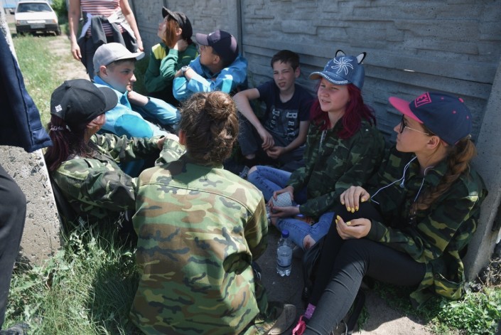 На одной из улиц Ленинского мы заметили группу ребят. Они отдыхали после нескольких часов работы.