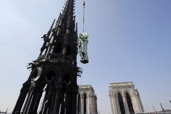 Главным объектом реставрации был шпиль, который полностью сгорел. 11 апреля рабочие сняли статую Святого Иоанна с его основания.
