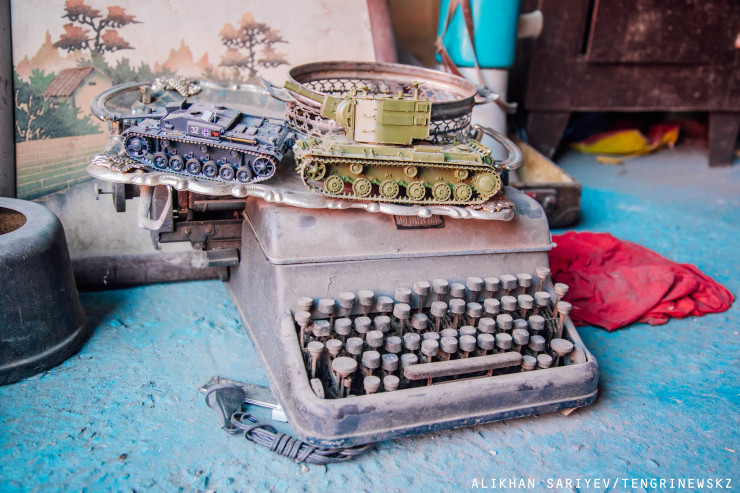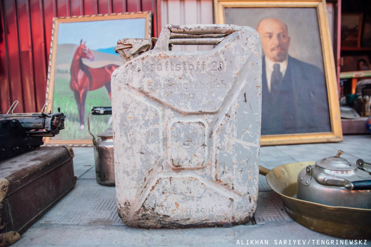 Всю продукцию нам приносят люди. Мне самому лично самовары нравятся царские, дореволюционные. Пятилитровые стоят 30 тысяч тенге. Есть машинка печатная, трофейная, Третий рейх, 30-е годы. За нее прошу 20 тысяч. А вот, к примеру, эта трофейная канистра мне прям в душу запала. Человек, который ее принес, рассказал, что она ему досталась от деда, который под Курском был. Видите, на ней даже написано "Вермахт, 1943 год", когда-то на танке "Тигр" стояла. Такую вещь за 20 тысяч тенге продам.