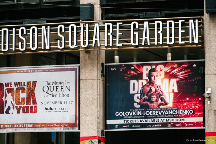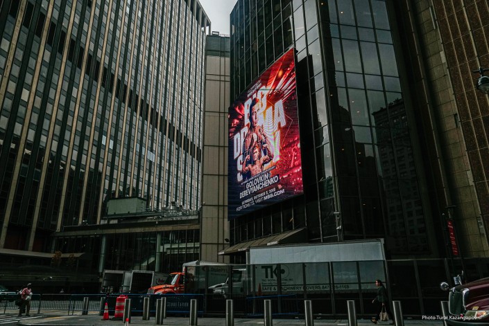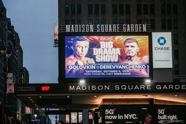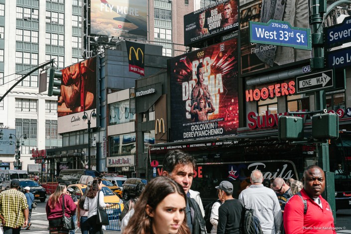 На Манхэттене уже давно пестрят афишы и плакаты предстоящего боя. Увидеть изображение Головкина и Деревянченко можно и на многочисленных LED-экранах.