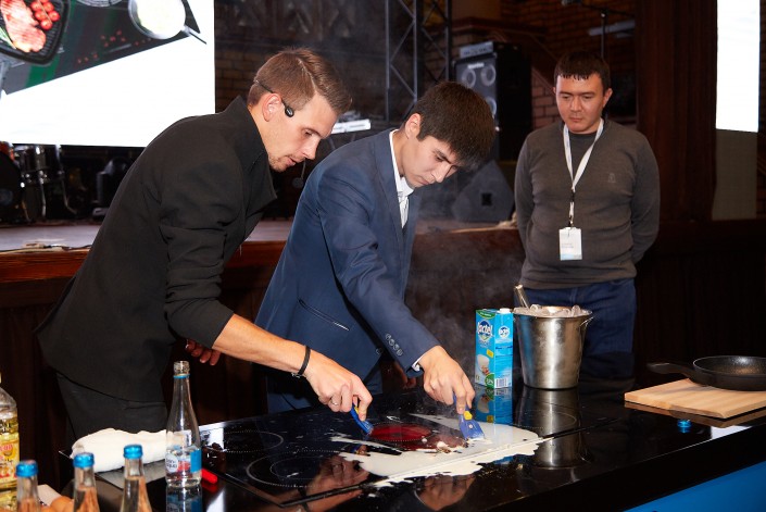 С продуктивностью Василия могла сравниться лишь стройная работа презентуемой техники – под управлением Емельяненко стильные варочные поверхности приобретали особенный шарм, приправленный ароматом поджаренной утки и запеченного картофеля.