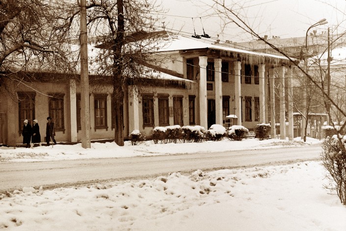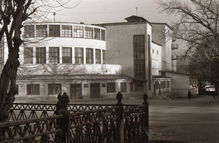 Бывшее здание театра НКВД. В дальнейшем оно стало русским драматическим театром. Ныне государственный уйгурский театр музыкальной комедии. Здание построили архитекторы стиля "Конструктивизм". Фото 1970-х годов.