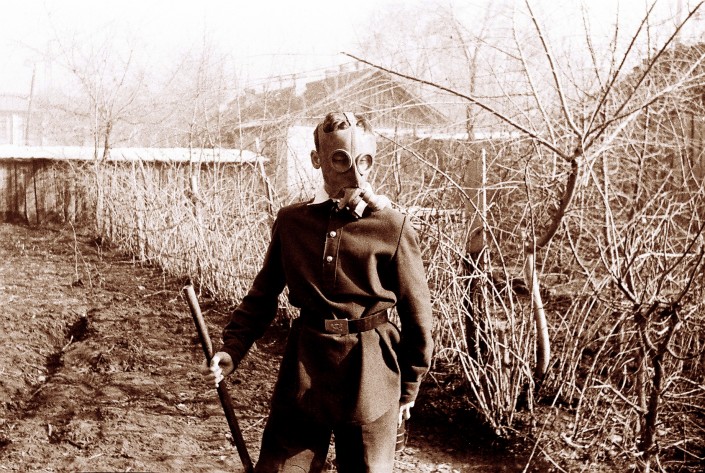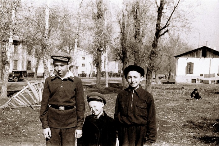 "Мальчик в противогазе - Витька Холодов. На нем школьная форма. Ремень в то время был обязательным атрибутом. Витька страшно увлекался кино. Напротив кинотеатра "Казахстан" был двухэтажный домик с огромной верандой на первом этаже. Там он через проекторы показывал слайды на стене, крутил их один за другим".