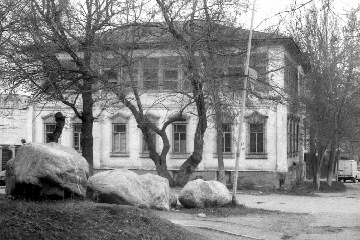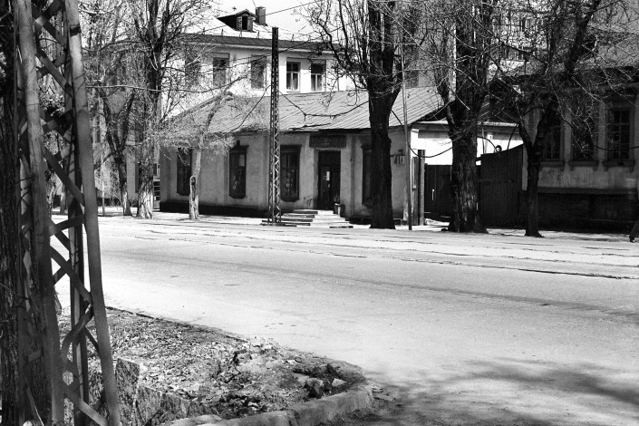 Дом садовода Бреусова. Улица Октябрьская (ныне Айтеке би), угол улицы Емелева (братьев Абдуллиных). В годы гражданской войны здесь размещался политотдел 3-й Туркестанской дивизии. В доме жил и работал писатель Д.А. Фурманов. Фото сделано в 1970-х годах.
