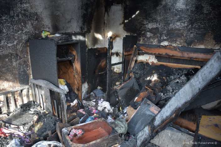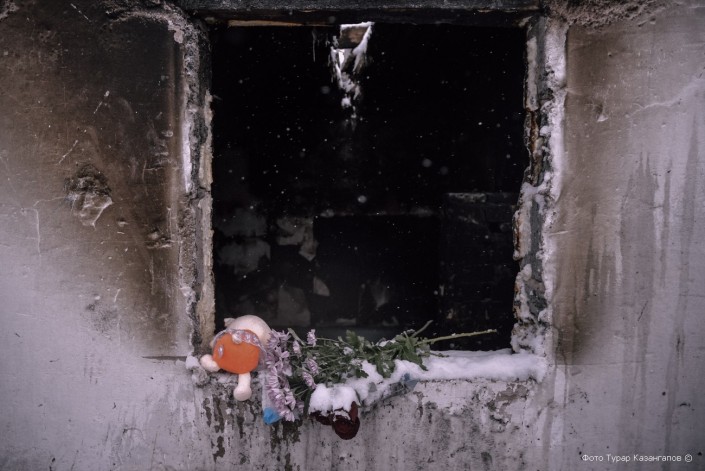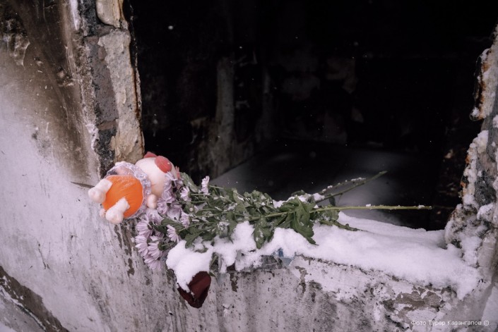 Маленькое обугленное строение. Это и есть сгоревшая времянка, в которой погибли пять девочек. Там, где было окно, сейчас лежат цветы и мягкая игрушка.