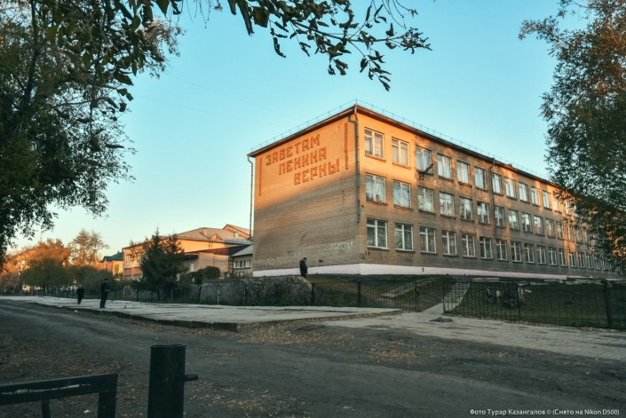 Надпись "Заветам Ленина верны" до сих пор присутствует на здании школы, которая все еще носит имя жены Владимира Ленина - Надежды Крупской.