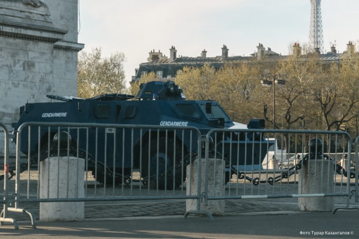 Возле Триумфальной арки, где еще вчера было много туристов, стоит броневик.