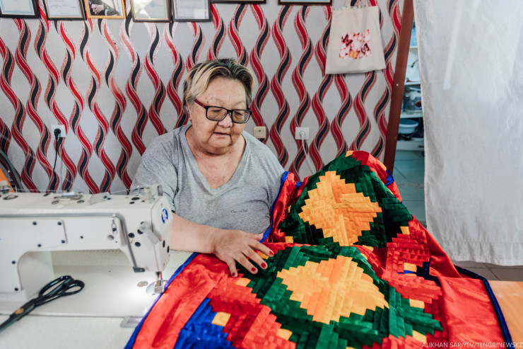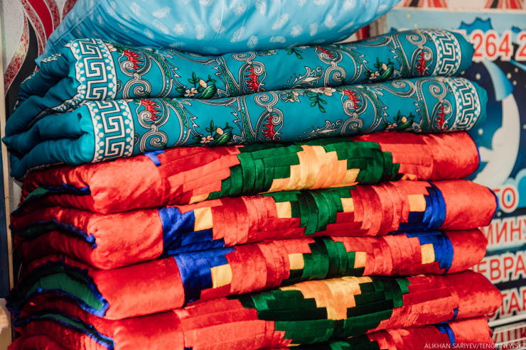 "А это курак (изделия из лоскутков, сшитых вместе - прим. авт.), - объясняет женщина, показывая на свою работу. - Означает "соединение", это для тех, кто замуж долго не выходит или не женится. На нем если поспать, сразу замуж выйдешь. Готовая корпешка у нас стоит 16 тысяч, а в Алматы такая 25 тысяч стоит".