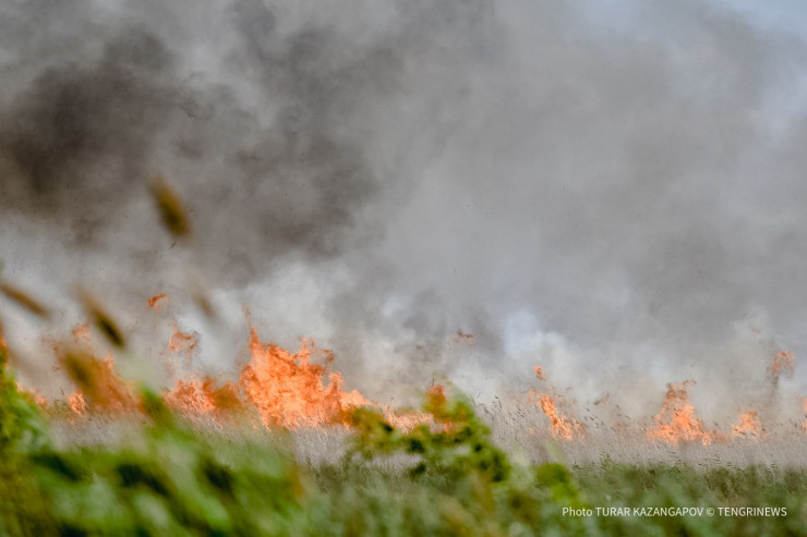На окраине Нур-Султана в болотистой местности из-за продолжительной жары загорелся сухой камыш. Вторые сутки пожарные борются с огнем, используя воду, песок и вертолет. Фотокорреспондент Tengrinews.kz снял степной огонь и задымленный Нур-Султан.