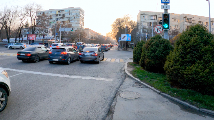"Перед Манаса нужно убрать крайнюю правую полосу, которая появляется за 30 метров до перекрестка. До перекрестка три полосы прямо. После перекрестка - две полосы прямо. Из-за этой третьей полосы автомобили выезжают прямиком на велополосу и едут по ней, образуя пробку на перекрестке.
