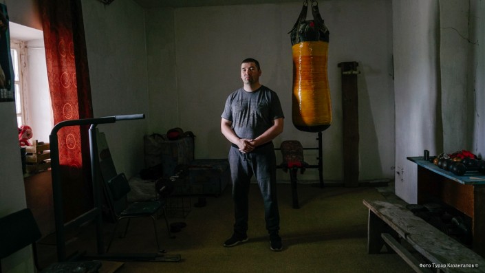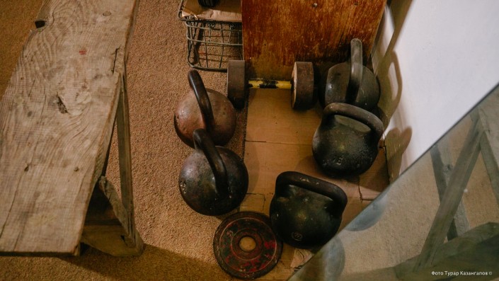 Нариман говорит, что у него два высших образования - учился на таможенника и учителя физкультуры. "Я вам могу свой спортзал показать", - предлагает он. Мы соглашаемся, и мужчина нас проводит через магазин во внутреннее помещение.