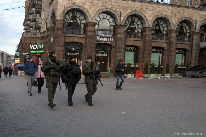 Местами в столице Украины можно заметить вооруженных людей в военной форме.