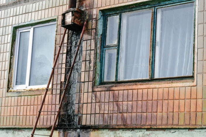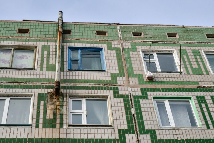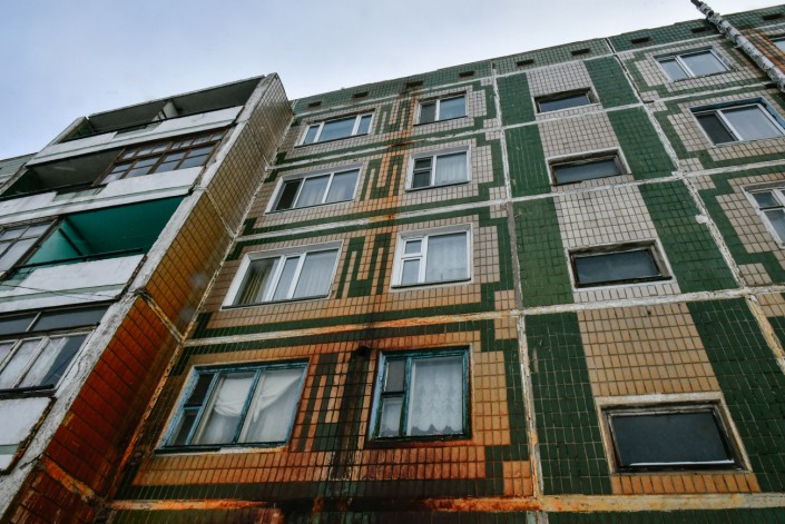 Даже издалека на единственной пятиэтажке в Автоматике можно разглядеть желтые и коричневые пятна. Это последствия отключения дома от центрального отопления.