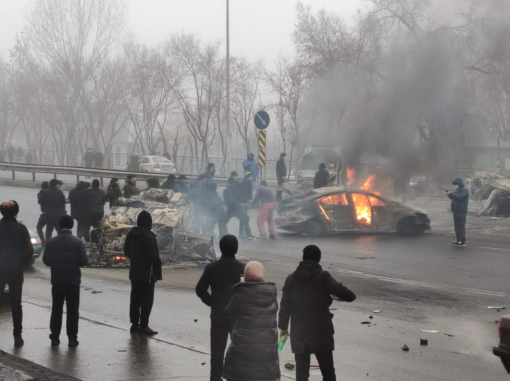 В ходе демонстраций в Алматы сожгли десятки автомобилей, разбиты витрины магазинов, передает корреспондент Tengrinews.kz.