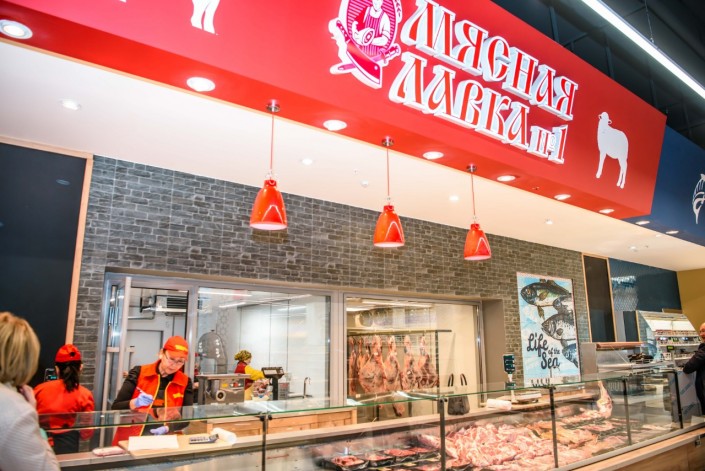 Гастрокухней представлен мясной отдел. За большой прозрачной стеной можно видеть, как специалисты порубят для вас на кусочки необходимого размера охлажденное мясо.