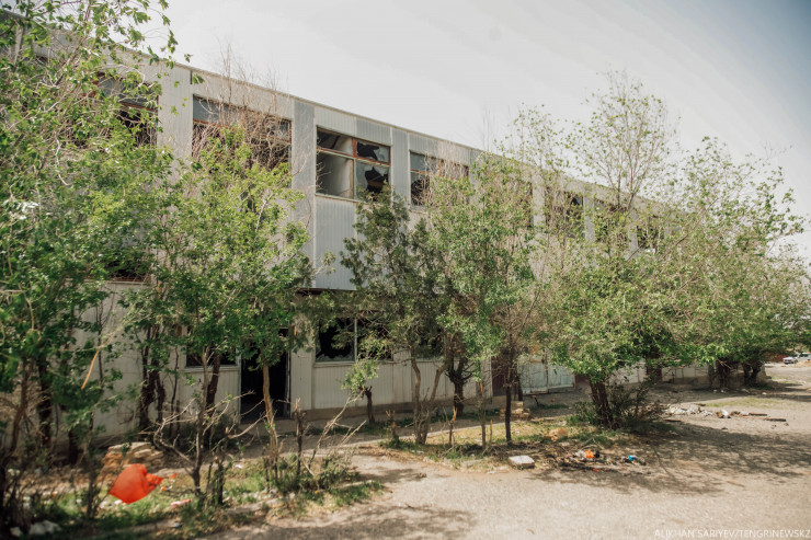 А вот бывшее здание трикотажной фабрики. Предприятие открылось в конце 1980-х, это был филиал знаменитой алматинской фабрики имени Дзержинского.