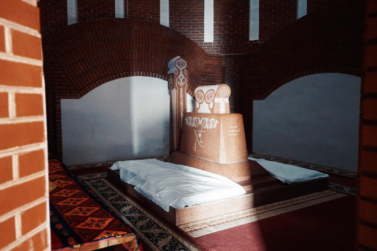 "По традиции у казахов оставляли на могиле вот такие камни. Один означает, что здесь похоронен батыр, а другой дает знать, что покоится здесь святой человек", - поясняет он и по темному коридору проходит в другой зал.