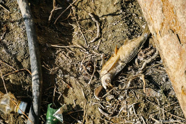 У самой воды лежит мертвая рыба.