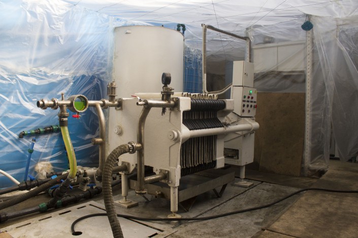 После подготовительной емкости отработанный антифриз фильтруется от мусора. Часто бывает, что сырье содержит комочки, осколки металла и тому подобное. Чтобы отфильтровать консистенцию, ее пропускают через пресс-фильтр. Он представляет собой куски, изготовленные из плотного материала, напоминающего брезент. Через "брезент" проходит множество трубок, по которым под высоким давлением прогоняется сырье, и на выходе получается чистая жидкость.