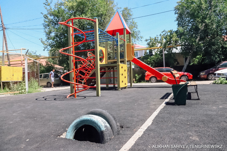 Что для нас стало очевидным плюсом - это новые детские площадки. Их мы увидели сразу в нескольких дворах. Правда, некоторые установлены с нарушениями. Например, вот эта на улице Сатпаева. Малышу, кажется, здесь будет небезопасно.