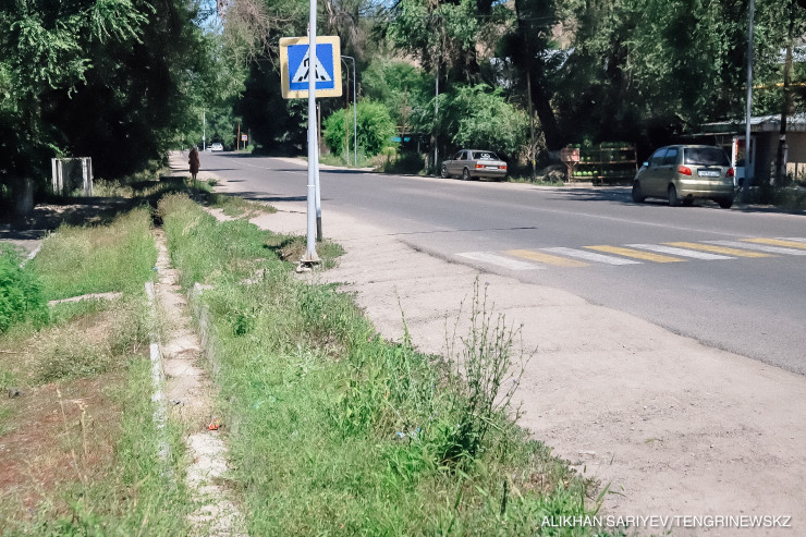Мы едем дальше и обращаем внимание на любопытный пешеходный переход. Это все та же улица Рыскулова, район магазина номер 3. Обратите внимание, куда упирается пешеходная дорожка. Верно, прямо в арык.