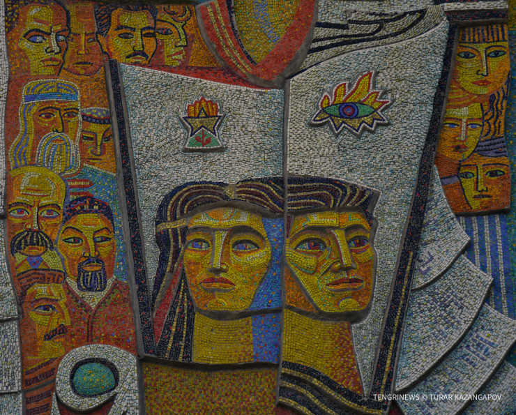"Эта мозаика называется "Печать". Здесь очень интересный момент: на ней были указаны названия советских газет, однако в наши дни их закрасили. Изображены на ней девушка и парень на фоне книги, как олицетворение печати, издательского дела. В этом здании отпечатывались городские и региональные газеты. На ней также можно увидеть изображения лиц деятелей культуры и просвещения, так или иначе связанных с Казахстаном. Например, Абай Кунанбаев, Сакен Сейфулин, Тарас Шевченко. Кто изображен еще, мнения расходятся. Я разговаривал с сыном одного из авторов мозаики, он говорит, что одна из изображенных девушек справа - это царица Томирис", - делится исследователь.