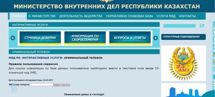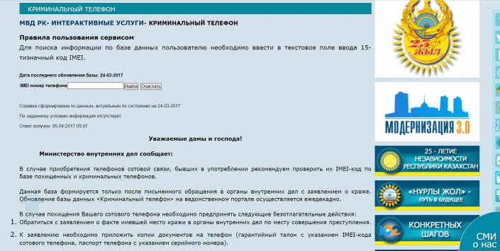 - если в течение месяца ваш телефон не обнаружится, то при наличии заявления в полицию вы можете проверить наличие сведений о IMEI-коде похищенного у вас телефона на сайте МВД РК. Таким образом вы удостоверитесь, разыскивается ли ваш телефон.