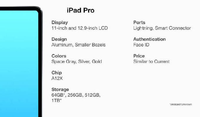 Корпус iPad Pro будет немного меньше, чем у предыдущих моделей, но размеры экрана останутся прежними: 11 и 12,9 дюйма. Процессор, очевидно, будет самым новым - A12X, а встроенной памяти до 1 терабайта. О цене и размере оперативной памяти пока ничего не известно. Цвета - такие же, как у флагманского iPhone XS.