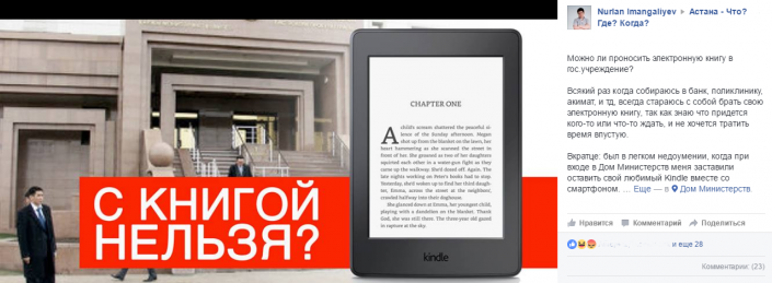 "Всякий раз, когда собираюсь в банк, поликлинику, акимат и так далее, всегда стараюсь с собой брать свою электронную книгу, так как знаю, что придется кого-то или что-то ждать, и не хочется тратить время впустую. (...) Был в легком недоумении, когда при входе в Дом министерств меня заставили оставить свой любимый Kindle вместе со смартфоном", - пишет в столичное сообщество Нурлан Имангалиев.