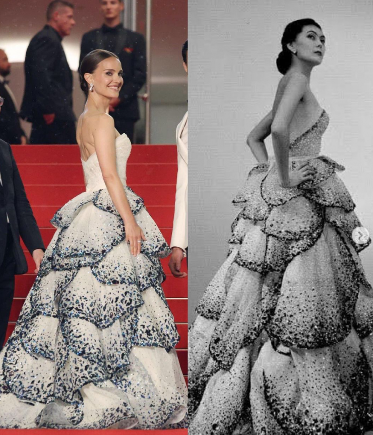 Портман позировала перед каннскими фотографами в реплике винтажного платья Dior из коллекции 1949 года. Наряд состоит из сверкающего корсета и пышной юбки в виде бутона цветка. Образ Натали дополнила серьгами из белого золота с бриллиантами, а волосы собрала в элегантный низкий пучок.