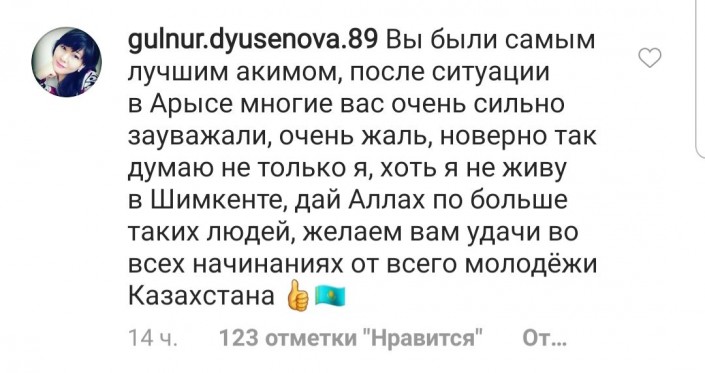 "Вы были самым лучшим акимом, после ситуации в Арыси многие вас очень сильно зауважали, очень жаль, наверно, так думаю не только я, хоть я не живу в Шымкенте... Желаем вам удачи во всех начинаниях от всей молодежи Казахстана", - высказывается @gulnur.dyusenova.89.