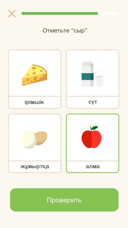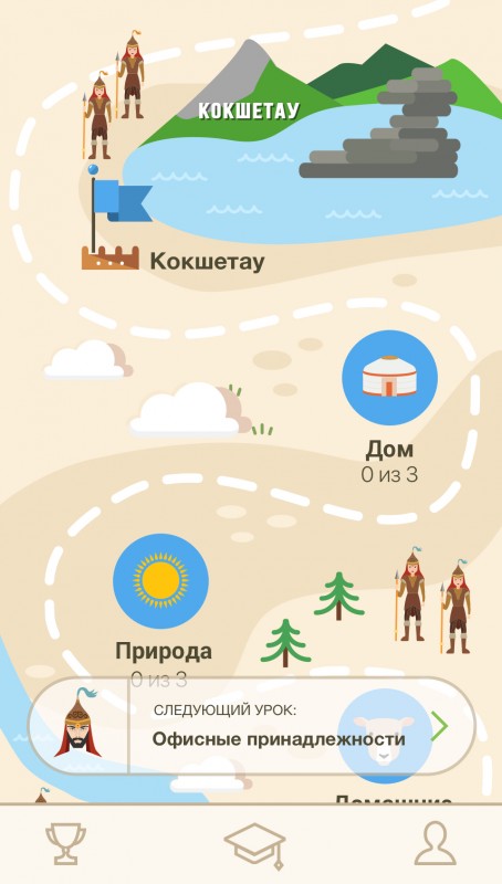 К примеру, приложение Qazaq App представлено в виде игры. Оно представляет собой путешествие батыра по городам Казахстана, где каждый город представляет собой главу урока. Проходя главу, батыр покоряет Казахстан, город за городом. В каждой главе содержится по три чаптера, в свою очередь состоящих из нескольких уроков. В каждом уроке представлены слова или фразы на казахском языке определенной тематики. Кроме перевода, практически к каждому слову прилагается ассоциативная картинка, которая поможет запомнить слово зрительно, а также транскрипция в виде озвучки — для усвоения правильного произношения. Каждый пройденный урок вознаграждает пользователя баллами-баурсаками. Доступен в App Store и Play Market.