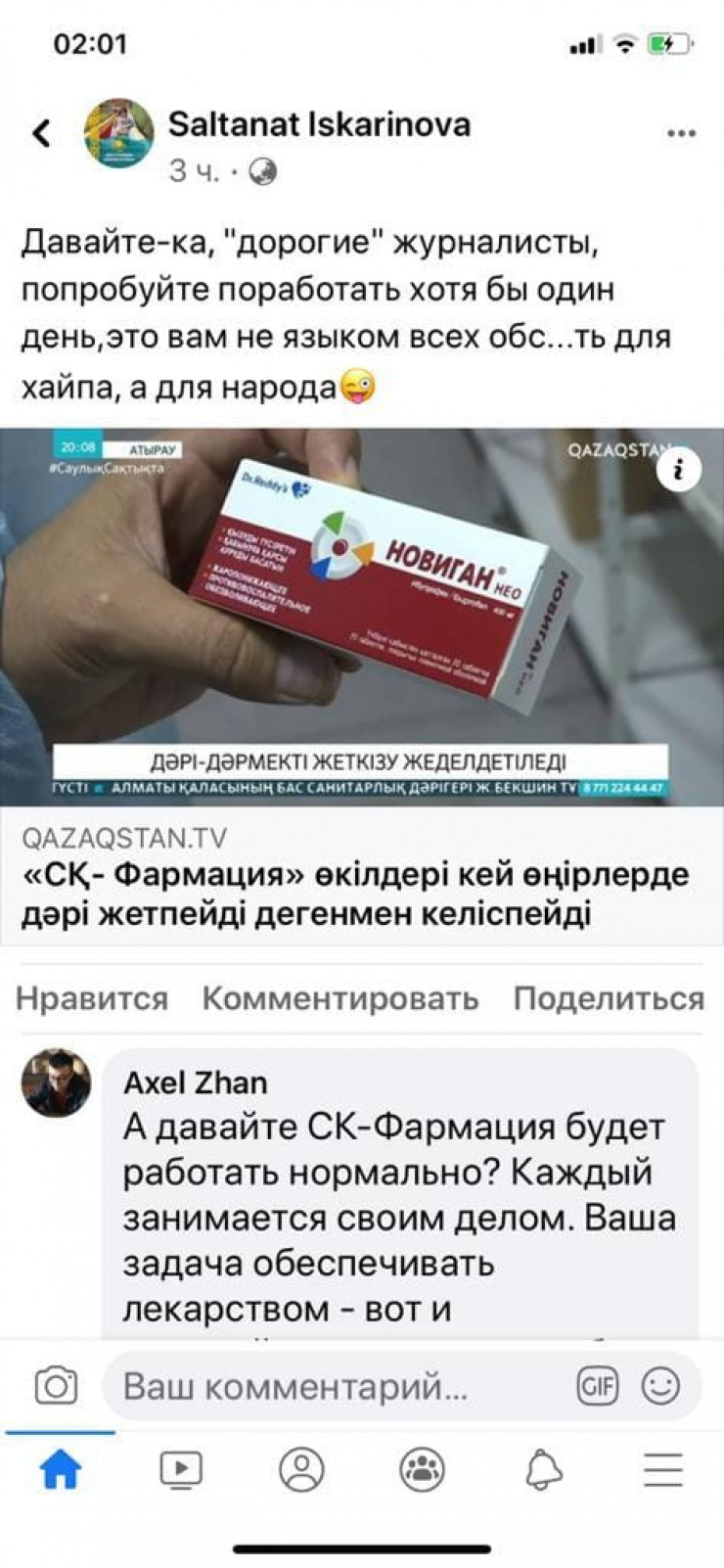 Советник главы "СК-Фармация" Салтанат Искаринова опубликовала пост в Facebook на своей личной странице, в котором попросила журналистов "поработать", обвинив их в желании "хайпа", передает Tengrinews.kz.