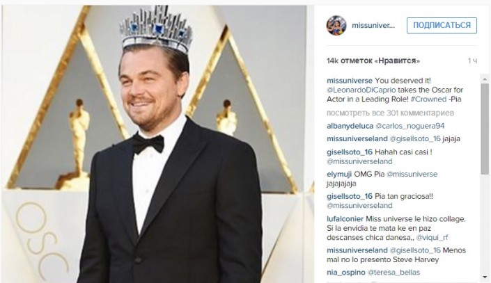 Мисс Вселенная поздравила Ди Каприо такой картинкой. "Ты заслужил это", - написала она в Instagram.