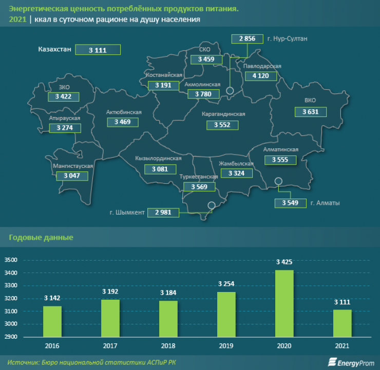 В четырех регионах калорийность оказалась ниже среднего значения по республике - в Нур-Султане (2856 килокалорий в суточном рационе на душу населения), Шымкенте, Мангистауской и Кызылординской областях. По калорийности питания лидировали Павлодарская (4120 килокалорий) и Акмолинская (3780 килокалорий) области.