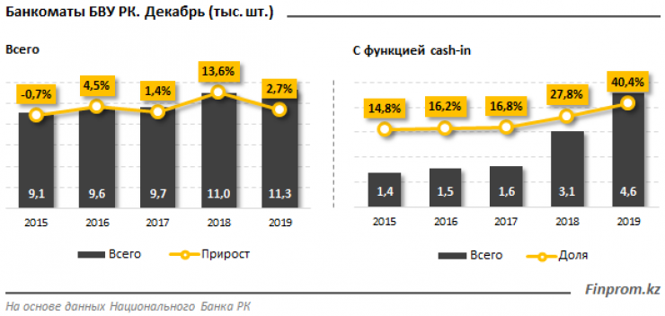Количество банкоматов в стране на конец 2019 года составило 11,3 тысячи - на 2,7 процента больше, чем в прошлом году. Рост был обусловлен увеличением числа банкоматов с функцией cash-in на 49,2 процента, до 4,6 тысячи, что увеличило их долю с 27,8 процента до 40,4 процента.