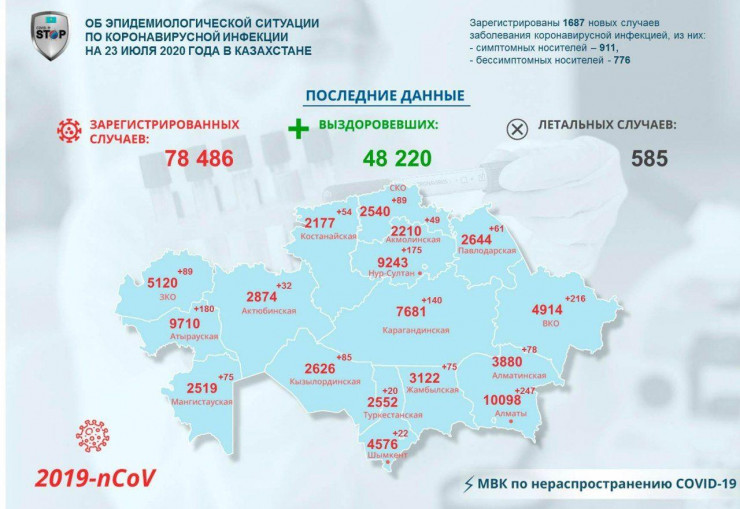 1687 человек заразились коронавирусом в Казахстане за сутки, передает Tengrinews.kz со ссылкой на МВК.