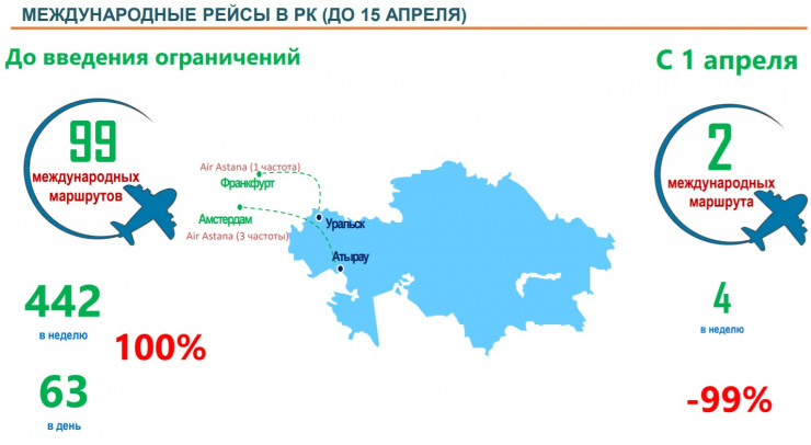 "В целях предотвращения распространения коронавируса в Казахстане по международным направлениям было сокращено 438 рейсов в неделю (с 442 до четырех частот). Закрыто выполнение всех регулярных внутренних рейсов, и отсутствует регулярное воздушное сообщение на территории страны. До 22 марта на внутренних маршрутах выполнялось 540 рейсов в неделю. Со 2 апреля приостановлены все внутренние регулярные рейсы между городами Казахстана", - говорится в сообщении.