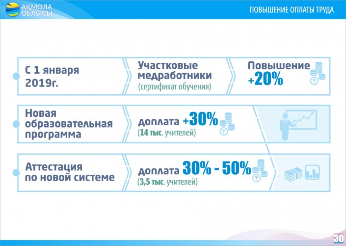 Для стимулирования работников первичного звена по поручению Президента с 1 января 2019 года начато поэтапное повышение заработной платы на 20 процентов участковым медработникам, перешедшим на новые формы работы, по аналогии с педагогами. 14 тысяч учителей, повысившие квалификацию по обновленной образовательной программе, сегодня получают 30-процентную доплату к заработной плате.