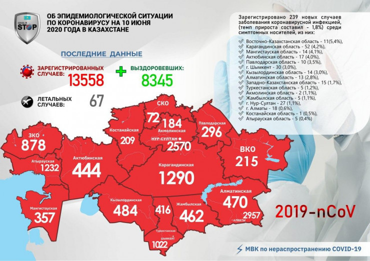 По состоянию на 10 июня в регионе 990 очагов заражения, из них в Караганде - 478 очагов. На эту же дату в области зарегистрировано 1290 случаев заражения, 590 пациентов выписаны.