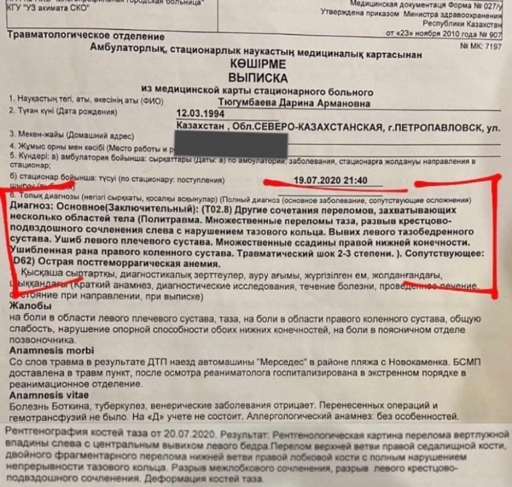 "Буквально через пару минут после этого я услышала, как завелась машина, что стояла позади нас. За рулем был 6-летний мальчик, который каким-то образом завел машину. Муж даже не успел зайти в воду на тот момент. А я успела только повернуть голову и увидела ехавшую на меня машину, которая была на расстоянии метра. Я не успела сделать абсолютно ничего. И я, и дети остались под авто. Я попала под колеса. Дети каким-то чудом обошлись царапинами на спинах и ногах. А вот мне повезло меньше: машина переехала колесами в области таза и волочила меня дном кузова на расстояние в 3-4 метра, так как мы были на склоне. Я была в шоковом состоянии, думала, что уже умираю", - говорит Дарина Тюгумбаева.