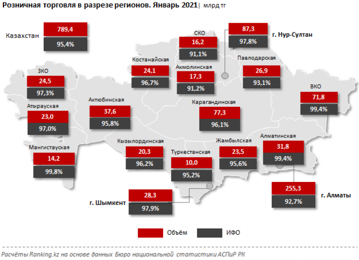 Индекс физического объема в регионах Казахстана варьировался от 91,1 процента до 99,8 процента, однако ни в одном не дотянул до 100 процентов, что говорит о повсеместном упадке реальных показателей ретейла.