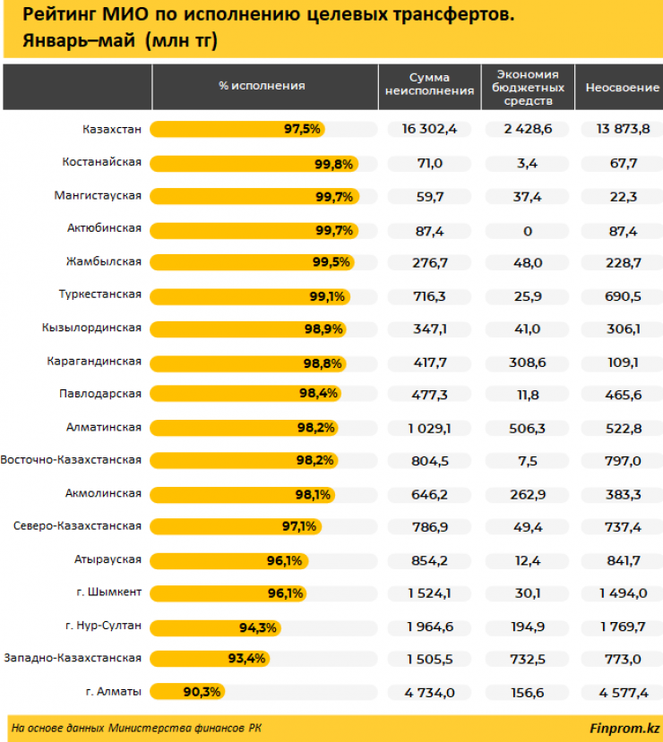 В разрезе регионов страны наибольшее неисполнение средств наблюдается в Алматы: уровень освоения в регионе составил всего 90,3 процента. Сумма неисполнения составила 4,7 миллиарда тенге, из них лишь 156,6 миллиона тенге - экономия средств, остальные 4,6 миллиарда тенге - неосвоение.