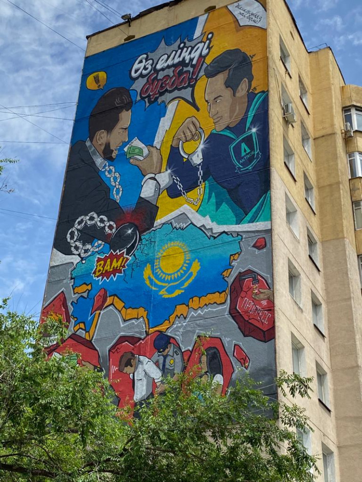 Ко Дню защиты детей молодые художники Алматы подарили городу мурал, посвященный борьбе с коррупцией. Интересное граффити нарисовали на фасаде жилого дома на пересечении улиц Мендикулова и Достык.