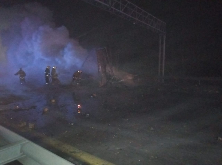 "Произошло возгорание полуприцепа грузового автомобиля марки DAF, груженного пиротехническими изделиями, на площади 30 квадратных метров, кабина транспорта в результате пожара не пострадала, сгорел полуприцеп полностью. Пожар локализован в 22.05. Движение на автодороге восстановлено в 22.40. Жертв и пострадавших нет. На месте работают силы ДЧС (19 сотрудников и четыре единицы техники)", - сообщила пресс-служба ведомства.