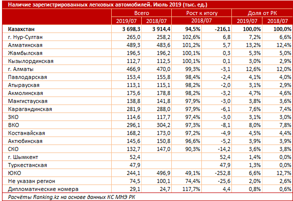 Годовой рост количества легковых автомобилей у населения был зафиксирован только в четырех регионах: в Нур-Султане до 265 тысяч (на 2,6 процента), в Алматинской области до 489,3 тысячи (на 1,2 процента), в Жамбылской области до 196,5 тысячи (на 0,1 процента) и в Кызылординской области до 112,7 тысячи (на 0,1 процента). Выросло и количество автомобилей с дипломатическими номерами - на 17,7 процента, до 29,1 тысячи машин.