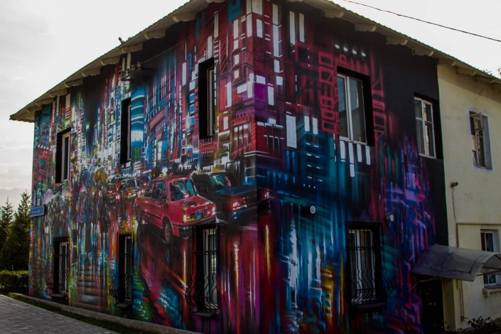 Молодой казахстанский художник, граффити-райтер Marskilla украсил здание в Алатауском районе Алматы. В его работе была использована стилистика digital (компьютерная графика), а также яркие цвета и динамика линий. Кроме этого, художник добавил несколько значимых деталей города. Это горы, домино и код Алматы.