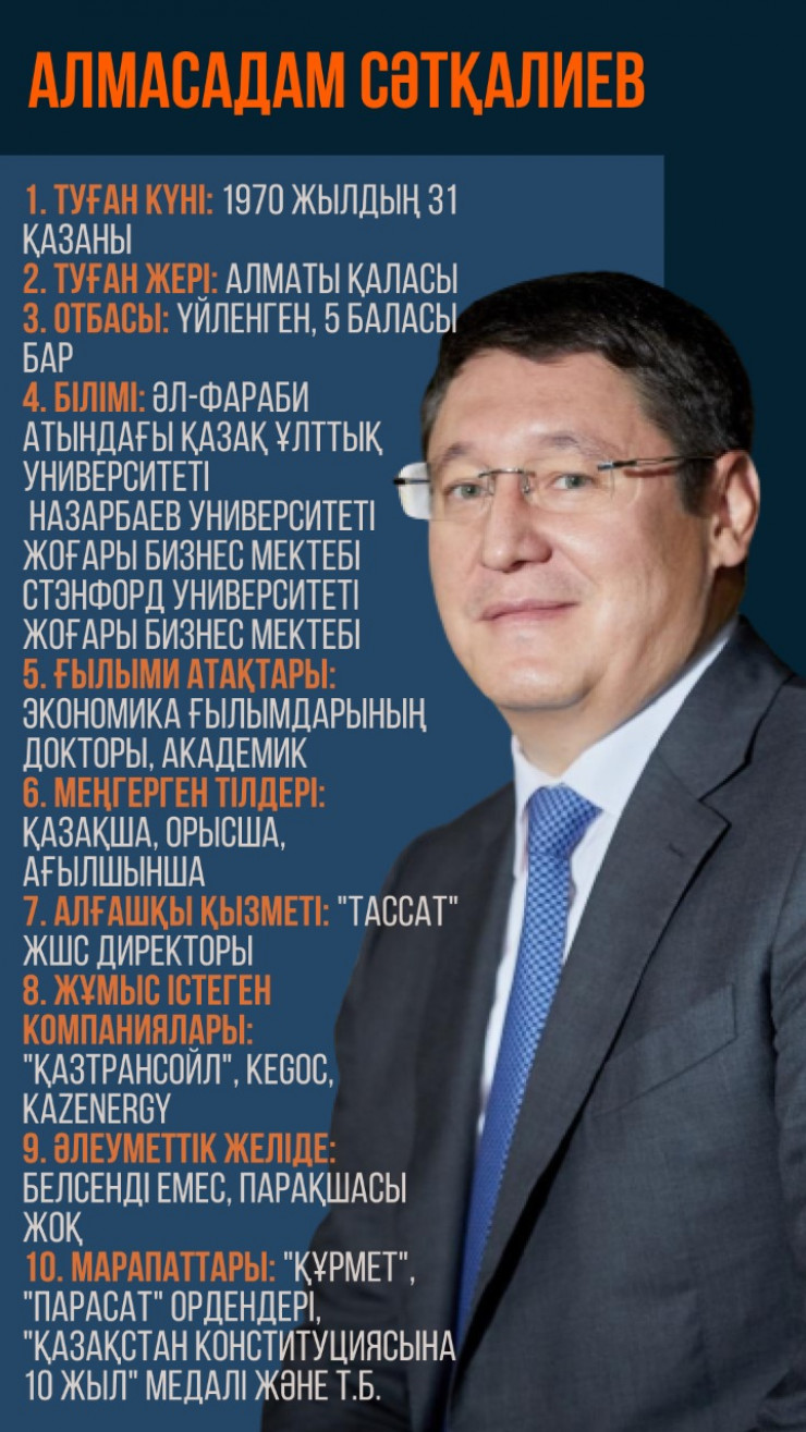 Кеше "Самұрық-Қазына" қорының басшысы болып Алмасадам Сәтқалиев тағайындалды. Бұған дейін ол қордың атқарушы директоры болып қызмет еткен. Еңбек жолының басым бөлігінде түрлі компаниядағы лауазымдарда болған. Tengrinews.kz тілшісі Алмасадам Сәтқалиев туралы қызық деректер жинады.