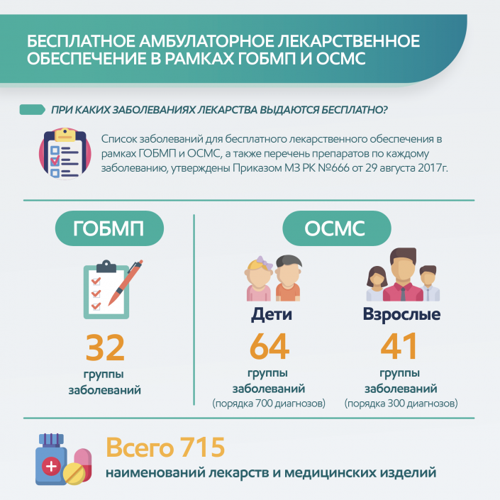 Обещают, что с внедрением обязательного медстрахования бесплатно лекарствами будут обеспечиваться все дети до 18 лет, тогда как раньше бесплатные лекарства предоставлялись только детям до 5 лет. Для этого в пакет ОСМС включили лекарственное обеспечение по 64 группам заболеваний, или по 700 диагнозам.